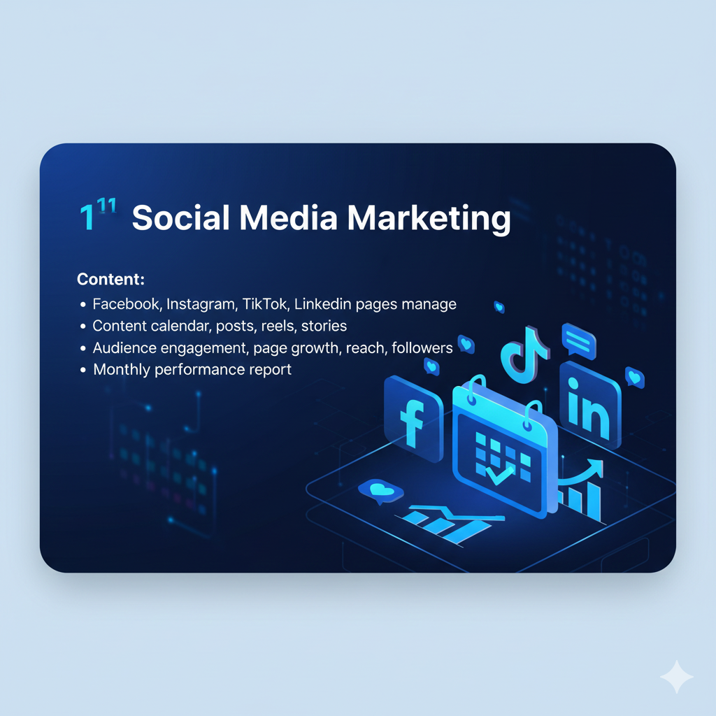 Take your brand to the next level with our social media solutions. We manage your Facebook, Instagram, TikTok, and LinkedIn pages, plan posts, reels, and stories, and engage your audience to boost growth, reach, and followers.Combine this with targeted Facebook and Instagram ads to reach the right audience, generate leads, and increase sales. Through A/B testing and optimization, we ensure your campaigns deliver maximum results.